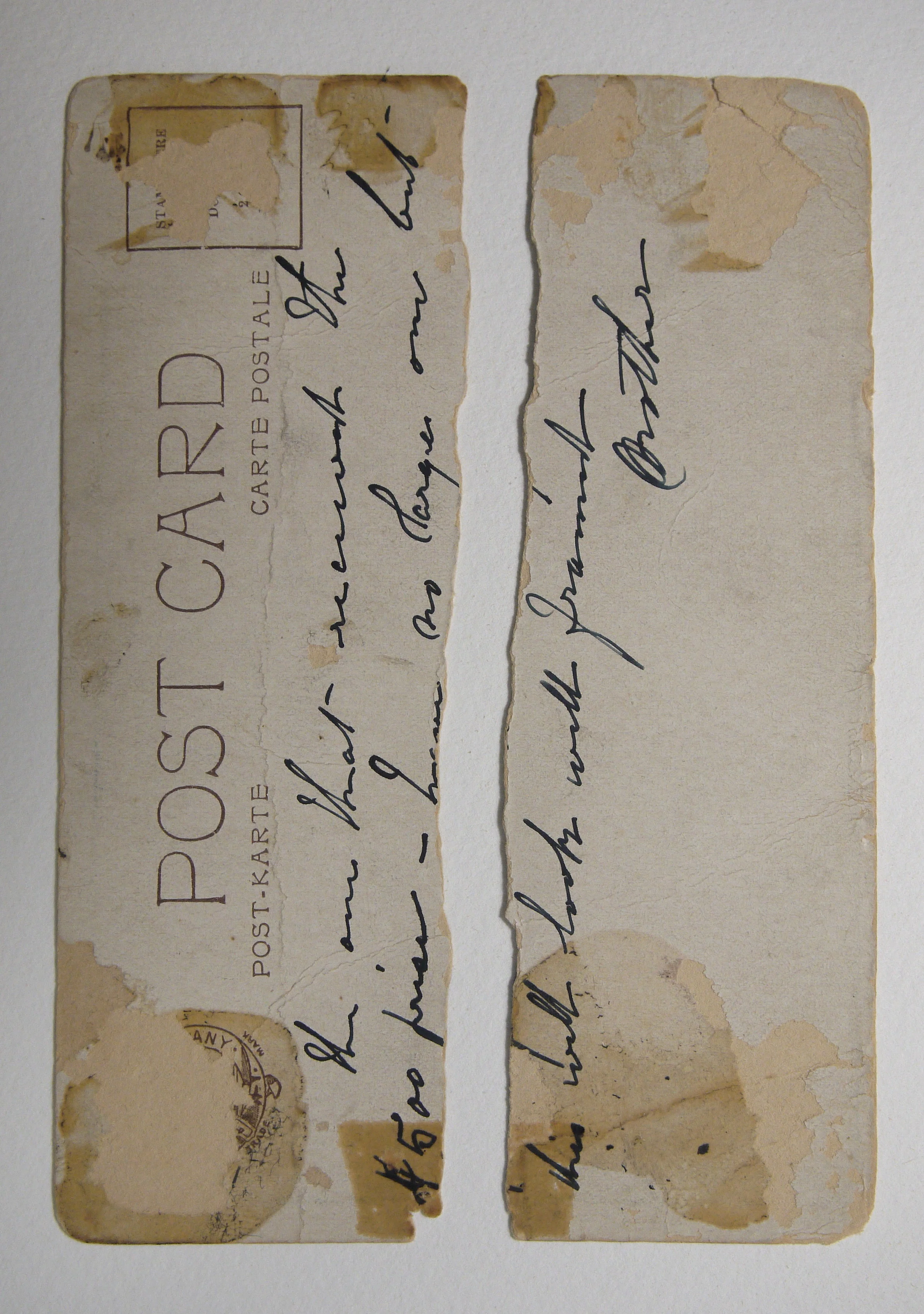 The postcard had been torn in two with a jagged vertical break, as well as suffering losses and abrasions to the printed surface. It is not a valuable item on its own, but represents an important moment in the artist's career, and is made more significant by the fact that the current location of the painting is unknown.